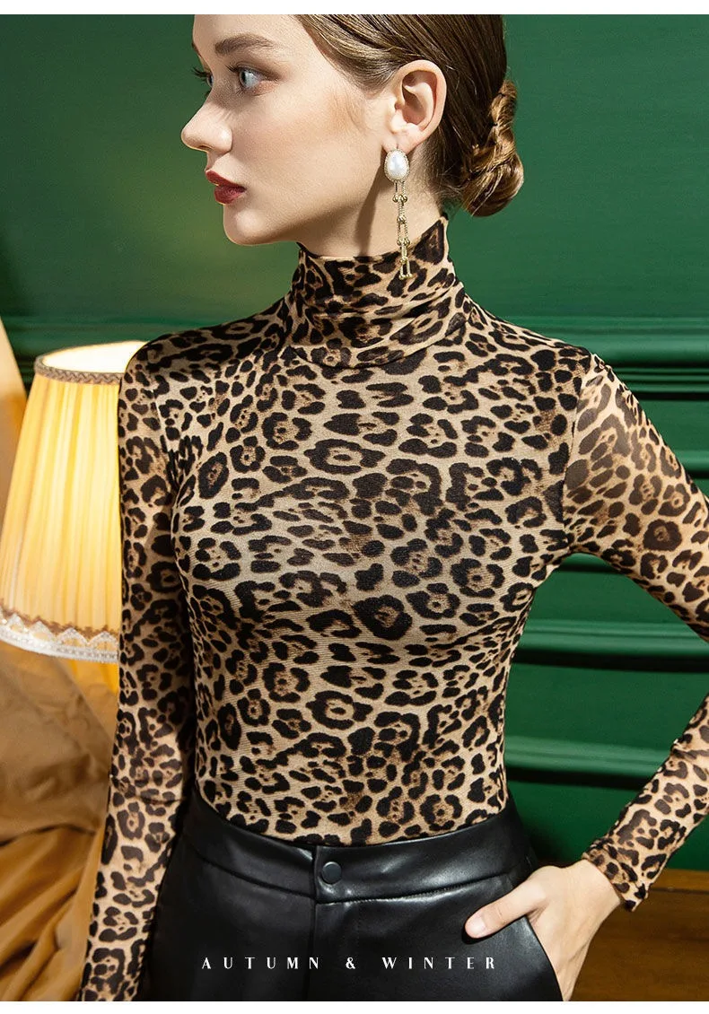Women Autumn Leopard Print High Collar Mesh Long-sleeved Tops